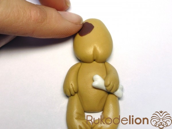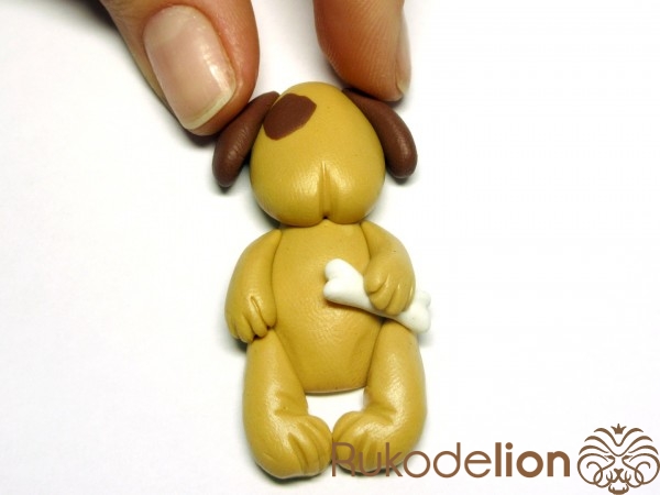 Прилепите голову к шее. Из коричневой полимерной глины слепите небольшую очень тонкую лепешку любой формы и прилепите к верхней половине головы, туда, где у собачки будет находиться глаз.