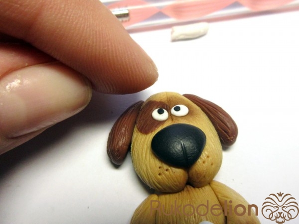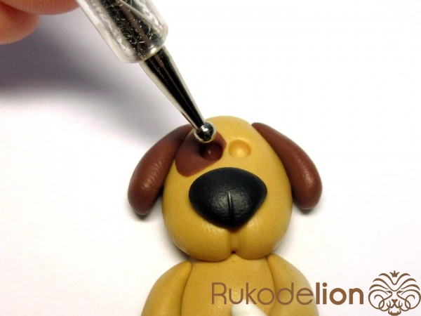 Прилепите нос к мордочке. Стеком с шариком сделайте два углубления выше носа, там, где будут находиться глаза собачки.