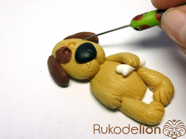 Теперь иголочкой прорисуйте шерсть на поверхности собачки. Следите за тем, чтобы шерсть на левой стороне собачки была направлена под углом влево, а на правой стороне – под углом вправо. Но с и косточку оставьте гладкими.