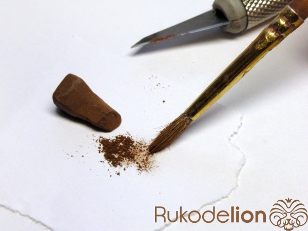 Коричневую сухую художественную пастель натрите ножом и возьмите ее на кончик сухой кисточки.