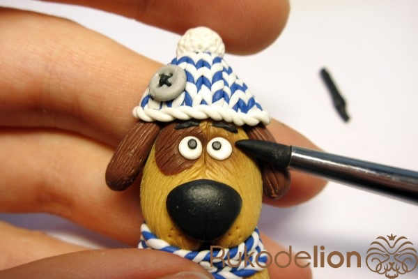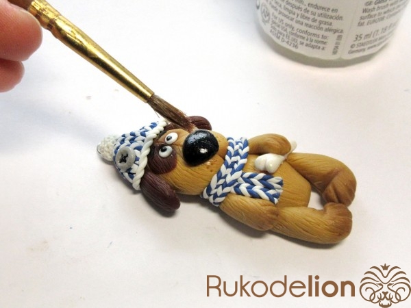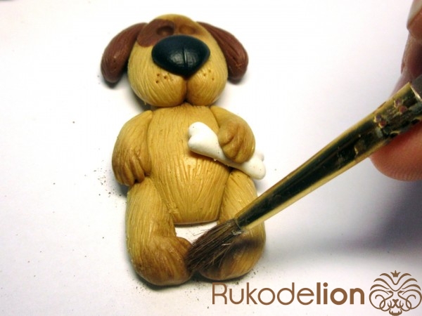 Чтобы у уже готовой собачки нос и глазки были блестящими, покрываем их глянцевым лаком для полимерной глины.