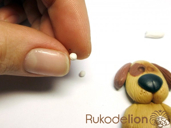Скатайте из белой глины 2 шарика, размер которых будет совпадать с размером углублений для глаз на мордочке.