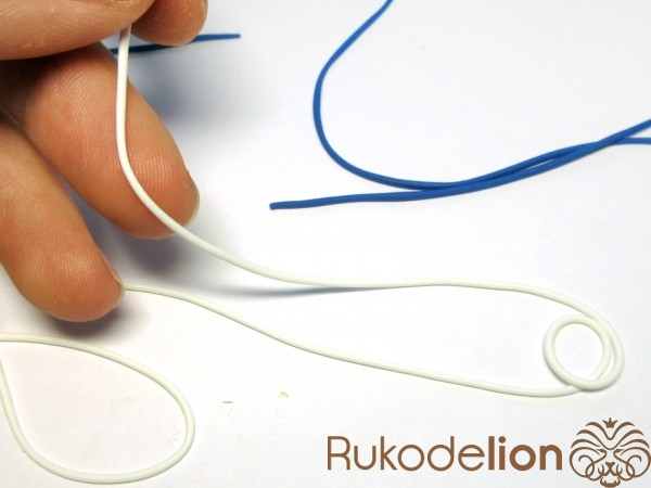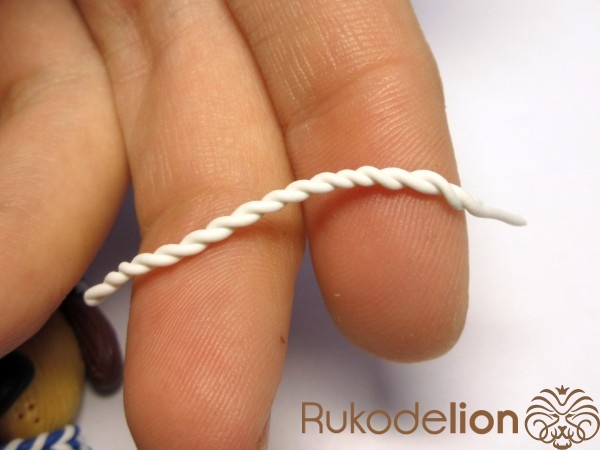 Дальше начинаем делать для нашей собачки «вязаную» шапочку и шарфик. Для этого скатайте тонкие колбаски белого и синего цвета.