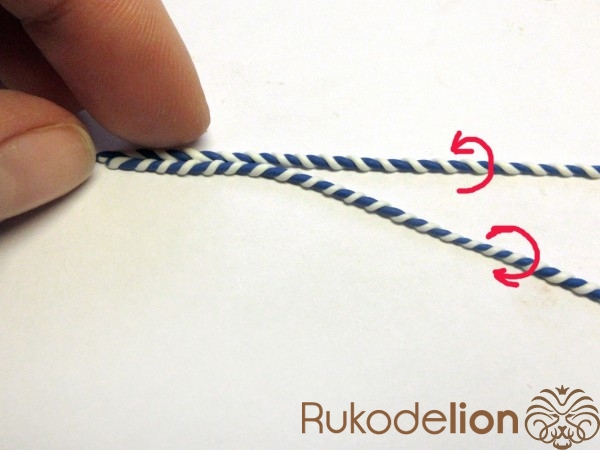 Далее сделайте второй такой жгут, но закручивать его нужно в противоположном направлении – по часовой стрелке. Сложите оба жгута плотно друг с другом на рабочей поверхности. Вместе они должны образовать узор в виде косички.