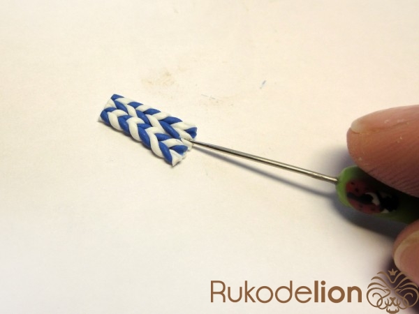 Таким образом, сложите рядом несколько жгутиков, чередуя те, что были закружены по часовой стрелке, и те, что закручены против часовой. От получившегося полотна отрежьте кусочек длиной 1,5см. По одному его краю сделайте несколько бороздок иглой.