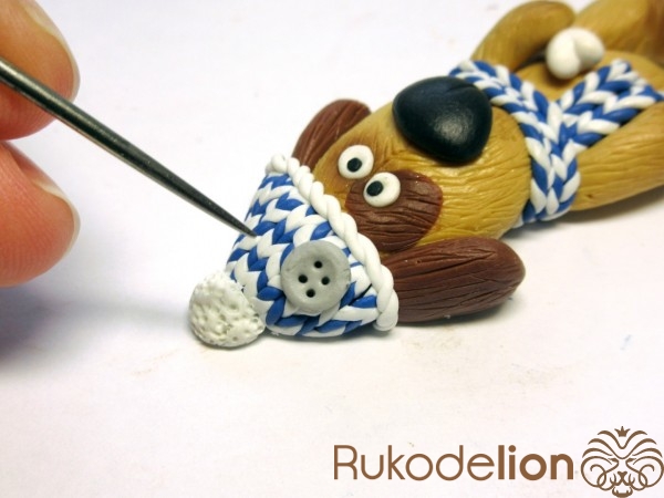 Прилепите его к нижнему краю шапочки. Затем из белой глины сделайте шарик, прилепите к верхушке шапки и немного поковыряйте его иглой, чтобы получился пушистый бубон. Из серой глины сделайте небольшую круглую пуговичку, прилепите к шапочке.
