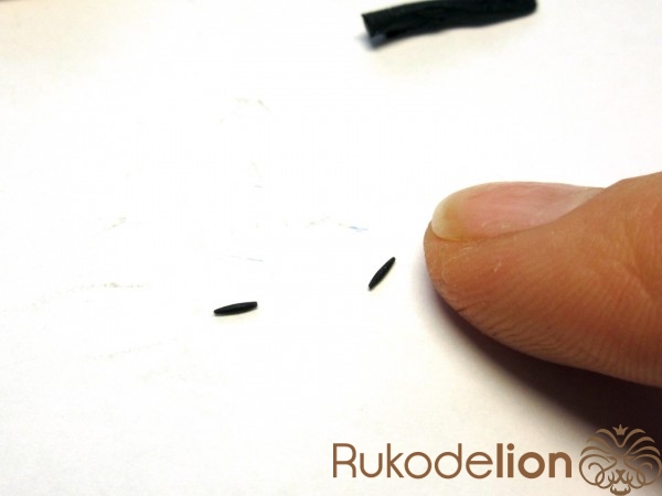 Из черной глины скатайте 4 тонких колбасок длиной 3мм.