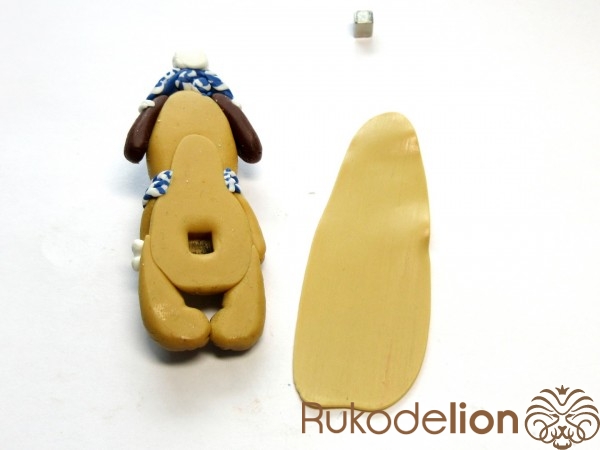 Наложите пласт на тыльную сторону собачки, ножом обрежьте лишнюю глину по контуру собачки.