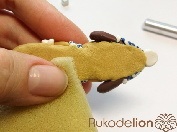 Теперь для собачки нужно сделать косточку. Для этого из белой полимерной глины скатайте овал длиной 1-1,5см. Далее рукояткой кисточки покатайте эту колбаску посередине, чтобы ее средняя часть стала тоньше, а концы остались более толстыми.