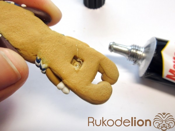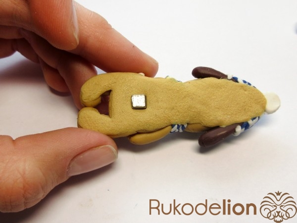 Сзади вдавите в туловище магнит (если у вас магнит плоский, то можно его не вдавливать, а просто приклеить позже к уже готовой фигурке).