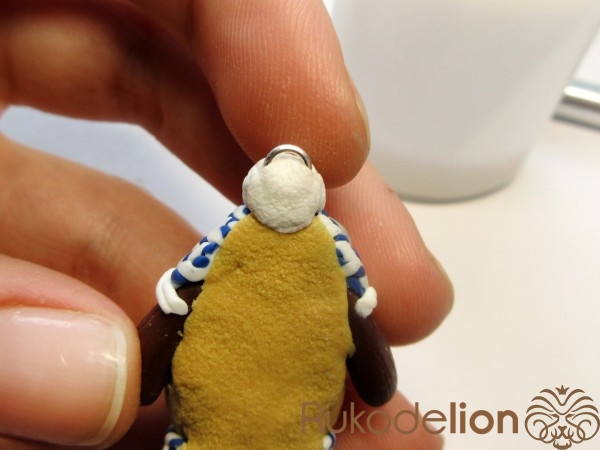 Если вы хотите вашу собачку еще и куда-то подвешивать, то можно на тыльную сторону бубона прилепить кусочек белой глины, вдавить в него бижутерное колечко, хорошо его залепить, чтобы оно выглядывало только сверху. И теперь мы снова отправляем собачку на повторное запекание.