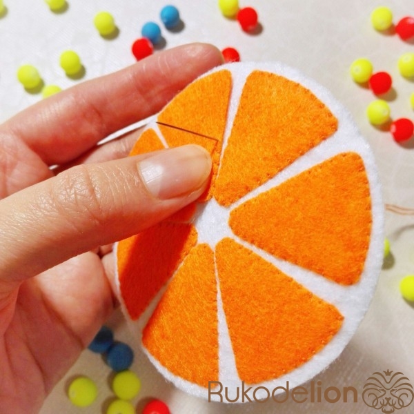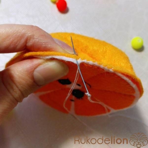 Придаем объем. Чтобы личико было плоским, как срез апельсина, использовала для придания формы круг из изолона. Тельце Апельсинчика набила синтепухом.