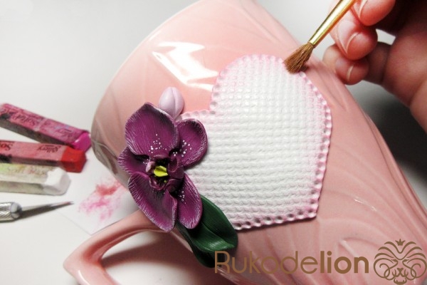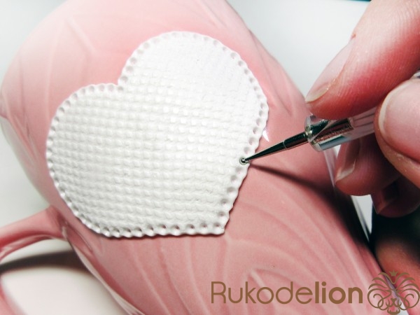 Поместите сердце на боковую сторону кружки, слегка придавите. Далее стеком с маленьким шариком сделайте углубления по контуру сердца