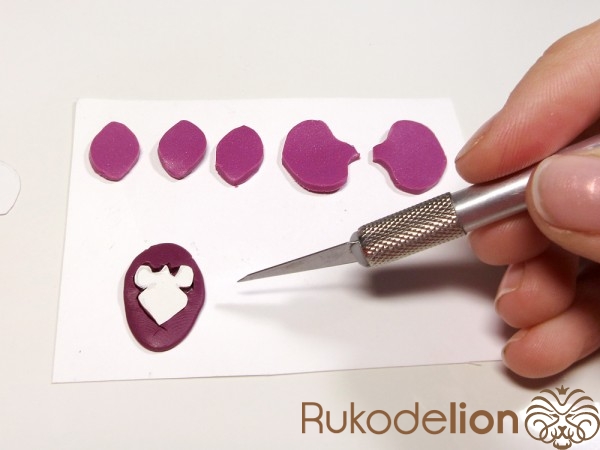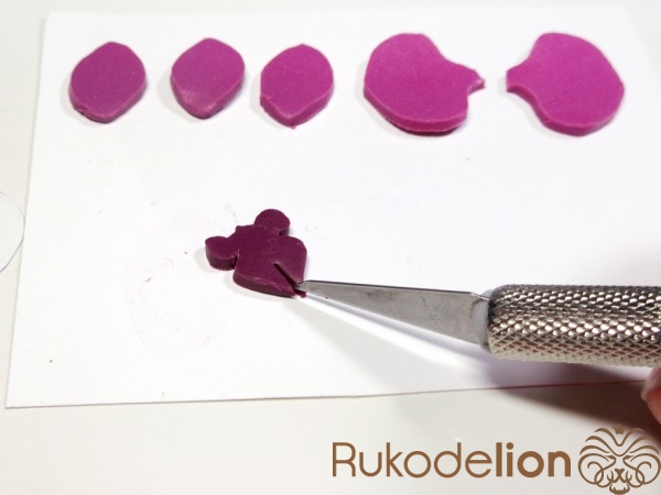 Сиреневую полимерную глину раскатайте в пласт толщиной 2мм. Сверху приложите шаблон боковых лепестков орхидеи и вырежьте 2шт. Затем приложите шаблон нижнего лепестка и вырежьте 3шт.