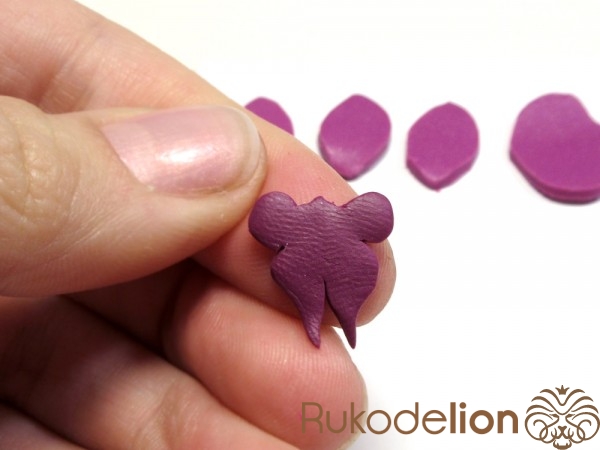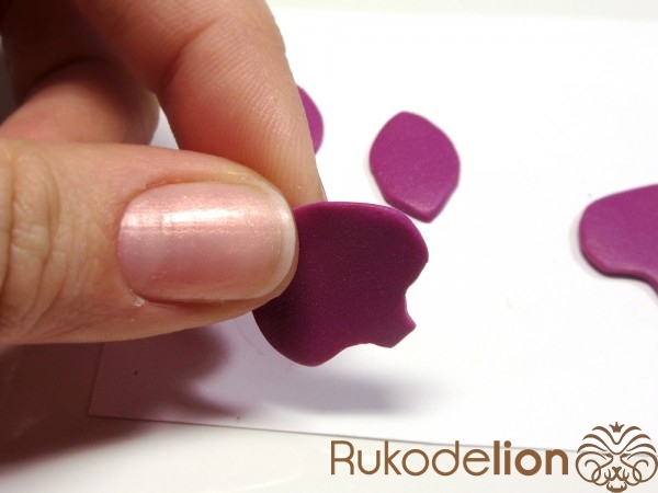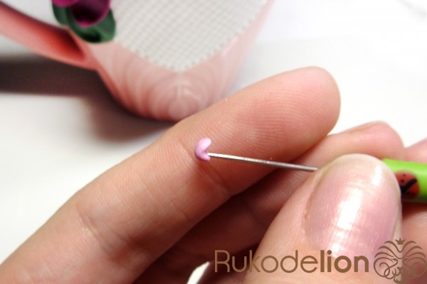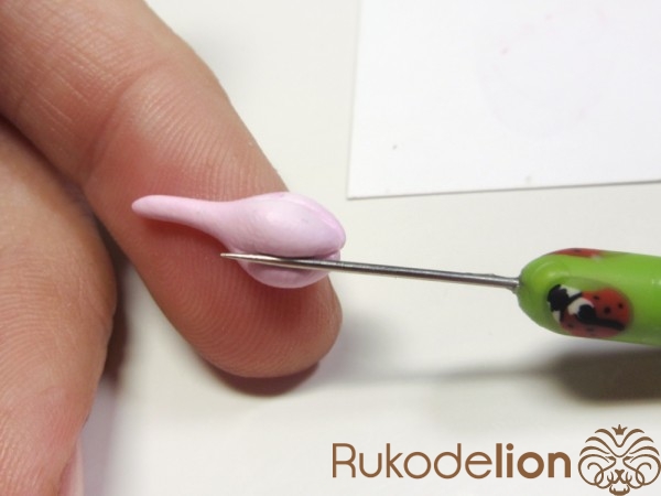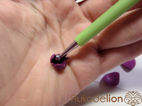 Возьмите маленький кусочек глины такого же цвета, как бутон. Сформируйте из него овал длиной 3мм, положите его на палец, сделайте иглой вертикальное углубление, а затем загните получившийся элемент в форме вогнутого лепестка.