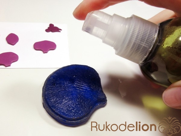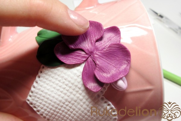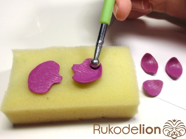 На лепестки можно нанести фактуру прожилок, если у вас есть молд. Если молда нет, то прожилки на лепестках можно не делать, либо можно их прорисовать при помощи иголочки. В случае использования пластикового молда, его сначала желательно сбрызнуть водичкой, чтобы глина не прилипала.