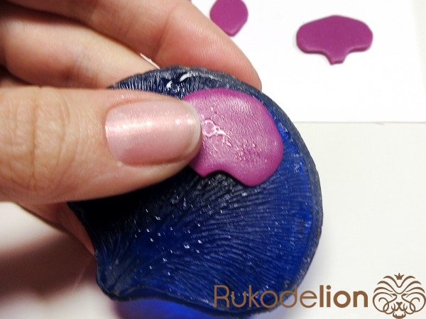 Теперь приложите лепесток к молду, слегка его придавите и осторожно снимите с молда. И так же нанесите фактуру на остальные лепестки, за исключением центрального.