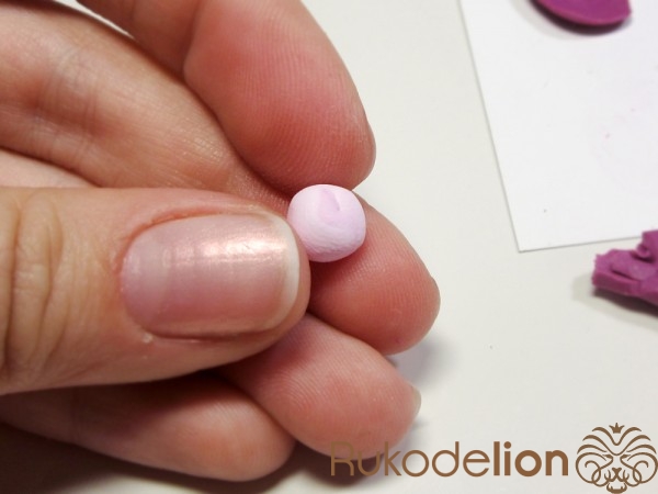 Теперь подготовим бутон. Для этого белую полимерную глину смешайте с кусочком сиреневой, чтобы получить светлый оттенок. Из этой глины сформируйте шарик диаметром 1см на продолговатой ножке.