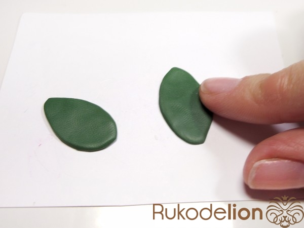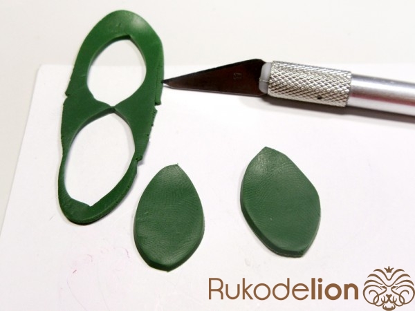 Дальше нужно сделать листья. Для этого раскатайте зеленую глину в пласт толщиной 2мм и из него вырежьте 2-3 овальных листа подходящего размера.