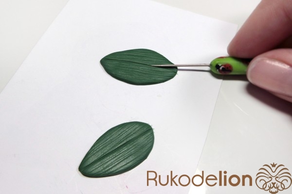 Иглой прорисуйте на каждом листе глубокую центральную прожилку и неглубокие вертикальные прожилки.