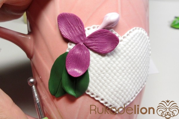 Теперь снова берем кружку с сердцем. Сбоку прилепляем два листика внахлест друг на друга, сверху прилепляем бутон. Возле бутона можно прилепить третий листик. И в промежутке между бутоном и листьями прилепляем три нижних лепестках орхидеи.