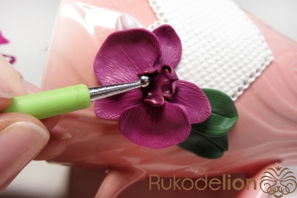 В центр орхидеи прилепите центральный лепесток, придавливая его стеком с шариком.