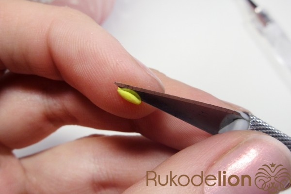 Возьмите такой же кусочек желтой глины, скатайте овал, сделайте углубление иглой либо ножом, но не загибайте.