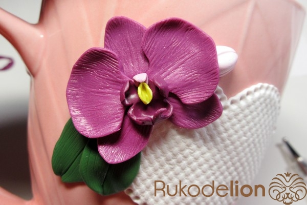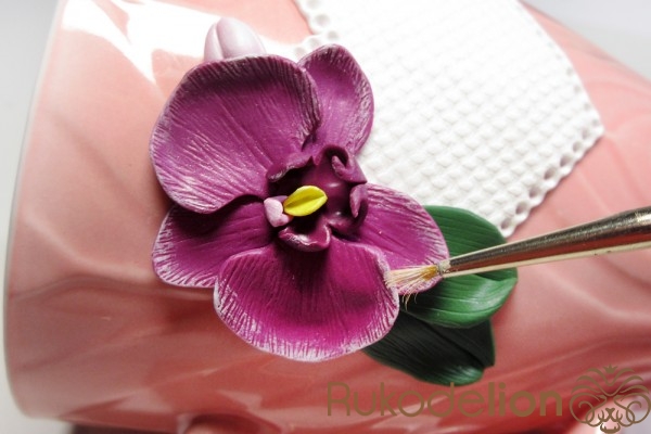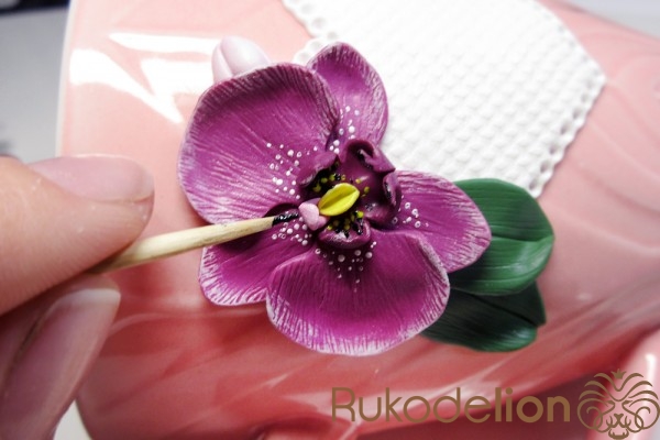Также краской можно нарисовать маленькие точки на боковых лепестках и на центральном лепестке орхидеи. Если краски нет, то можно сделать маленькие точки на лепестках из очень маленьких шариков, скатанных из полимерной глины желаемого цвета.