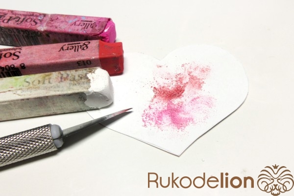 Теперь берем сухую художественную пастель розового цвета. Если розового цвета нет, можно взять сиреневый или же смешать белую пастель с красной. Для этого ее нужно наскоблить ножом в мелкий порошок.