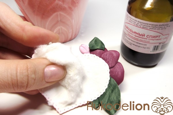 Затем кружку и заднюю сторону декора протрите ватой со спиртом, чтобы обезжирить.