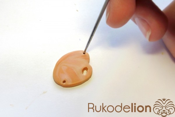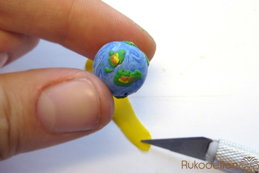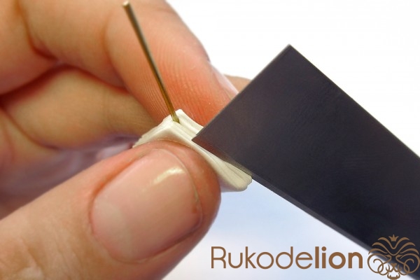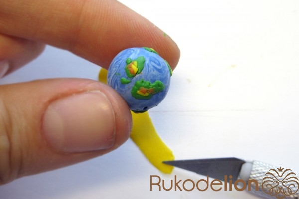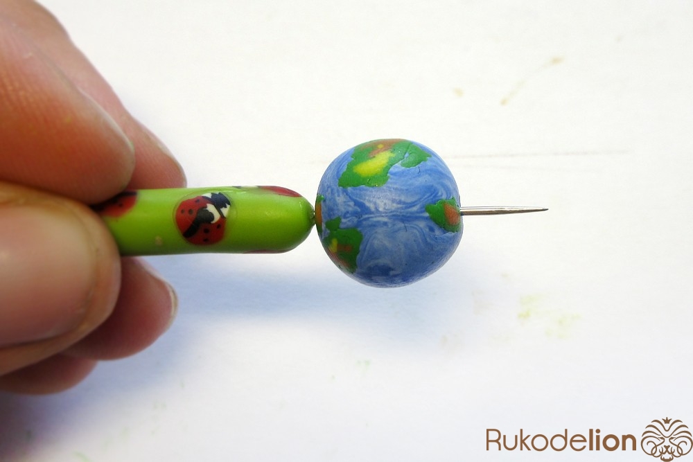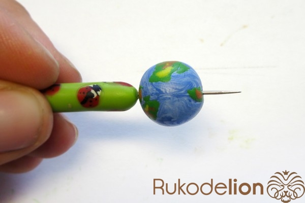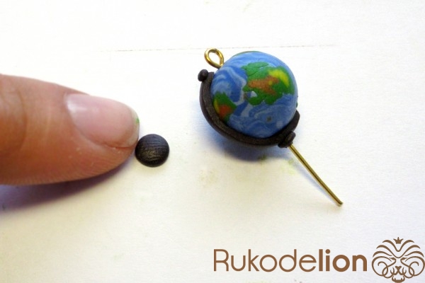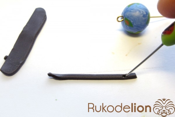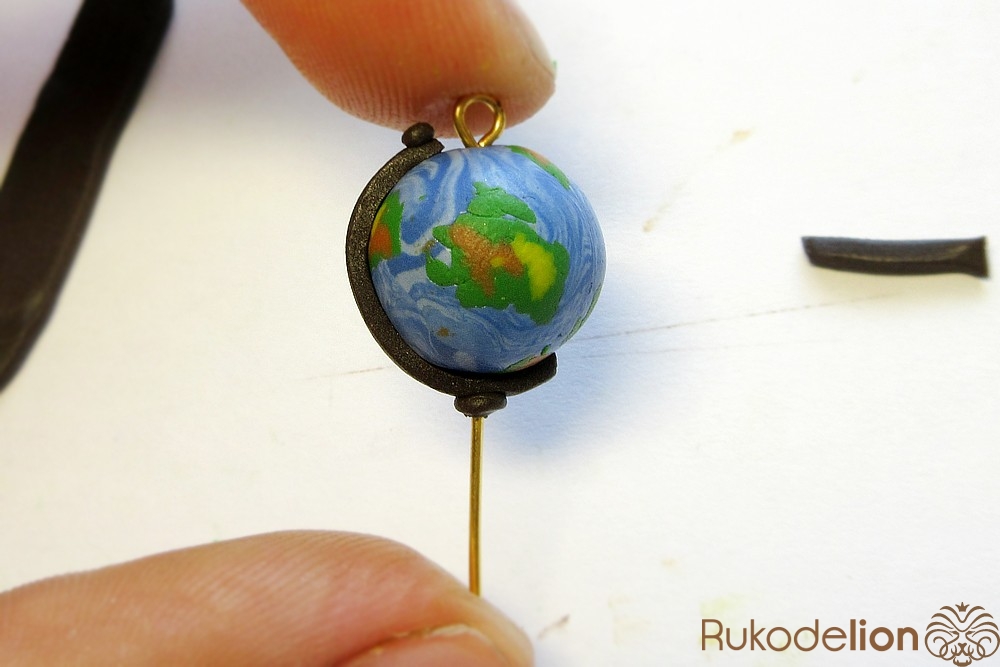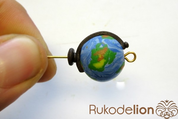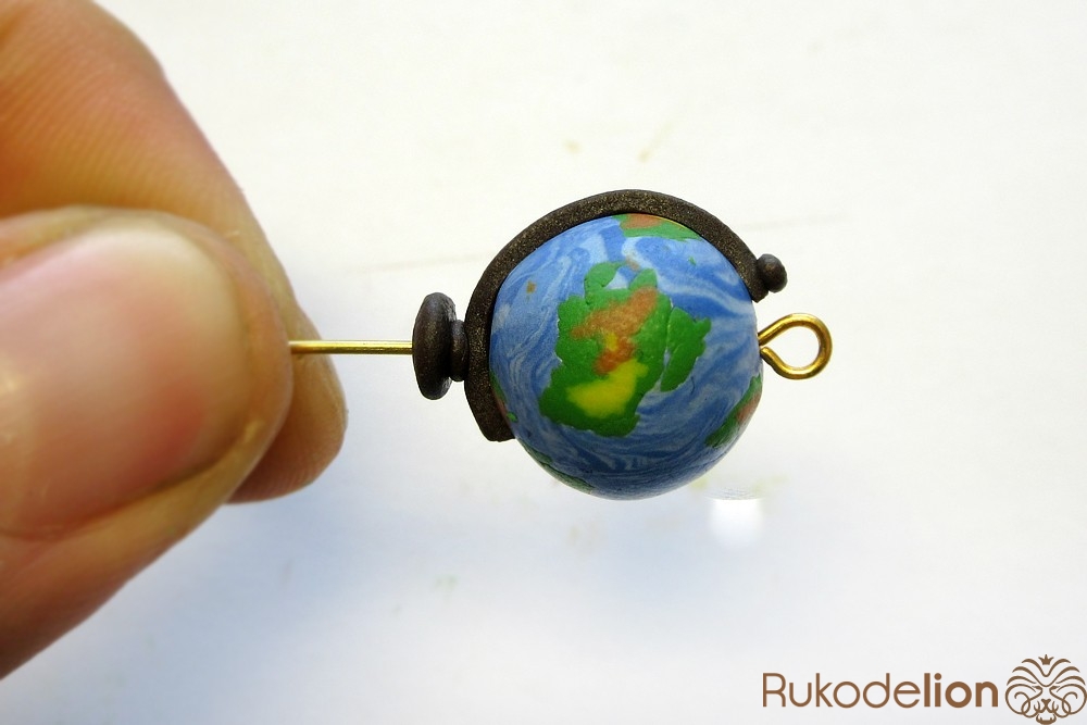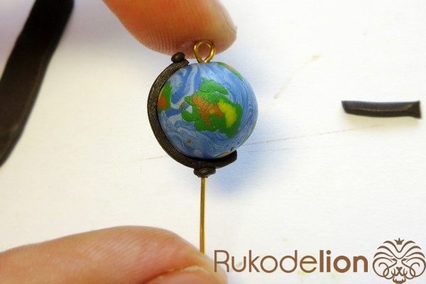 Наденьте шарик на бижутерную булавку. Затем не острый конец наденьте темно-коричневую ленту через сделанное в ней отверстие, а длинную часть ленты уложите полукругом на поверхности шарика, лишнюю длину обрежьте, чтобы конец ленты не доходил несколько миллиметров до ушка булавки. Прилепите маленький шарик темно-коричневого цвета на верхний конец ленты и такой же шарик наденьте на булавку вплотную к ленте снизу шарика.