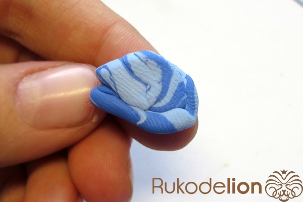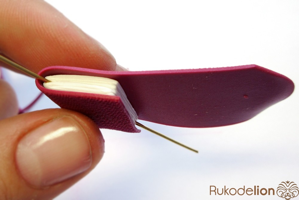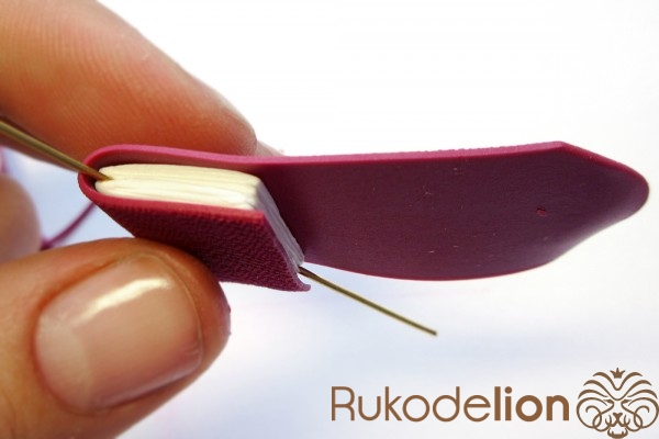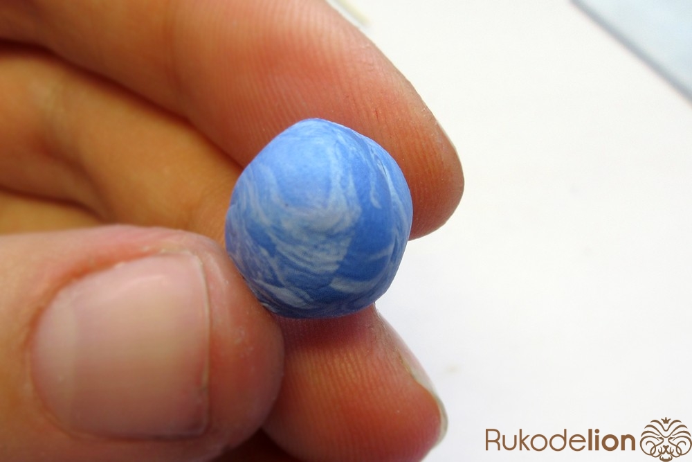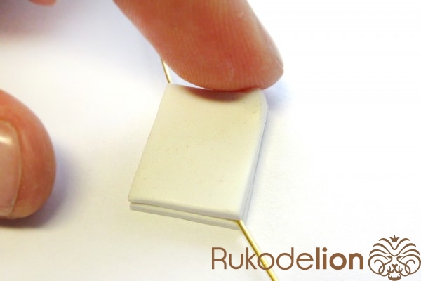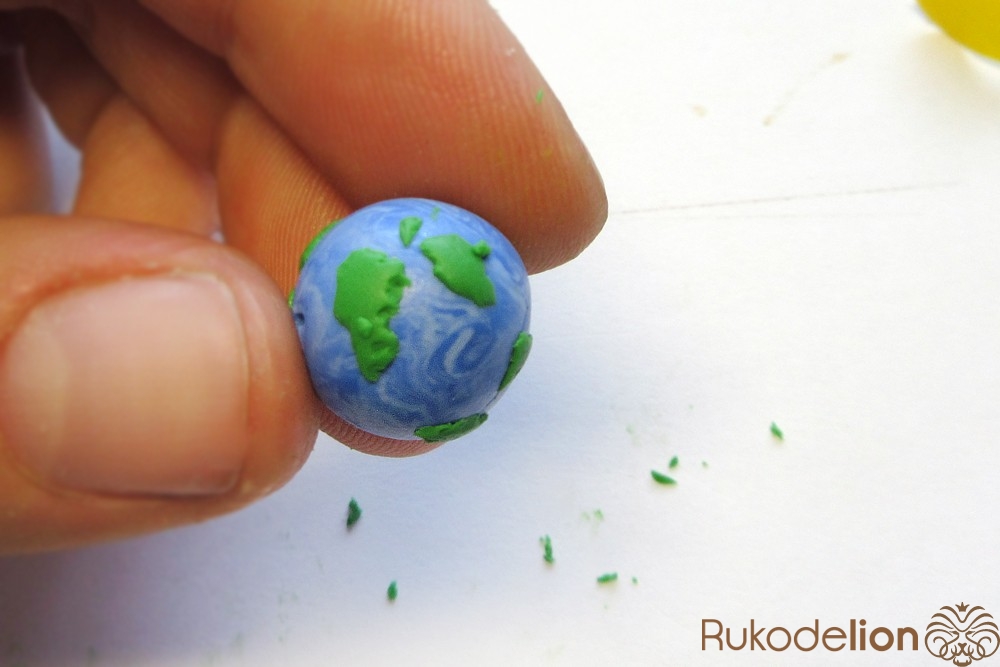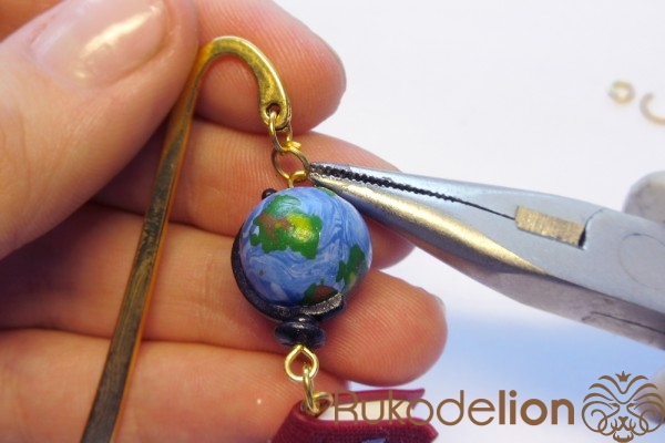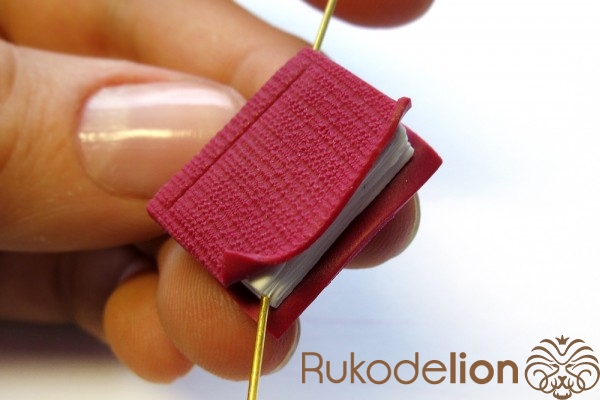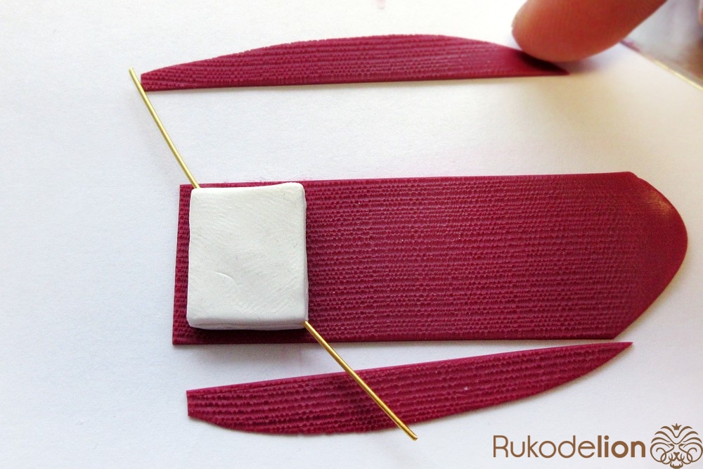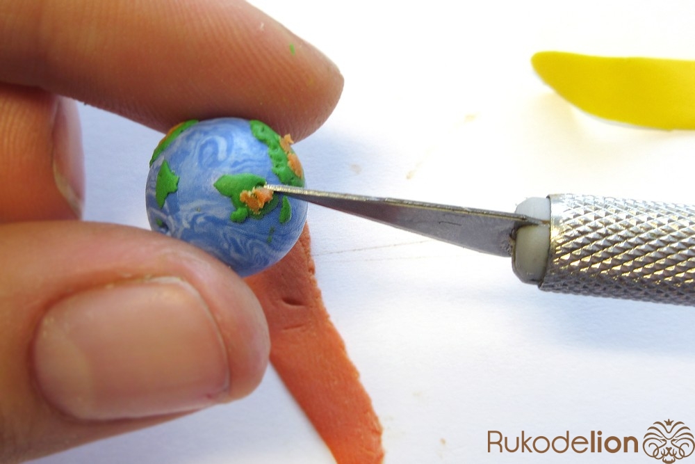 Наденьте шарик на бижутерную булавку. Затем не острый конец наденьте темно-коричневую ленту через сделанное в ней отверстие, а длинную часть ленты уложите полукругом на поверхности шарика, лишнюю длину обрежьте, чтобы конец ленты не доходил несколько миллиметров до ушка булавки. Прилепите маленький шарик темно-коричневого цвета на верхний конец ленты и такой же шарик наденьте на булавку вплотную к ленте снизу шарика.