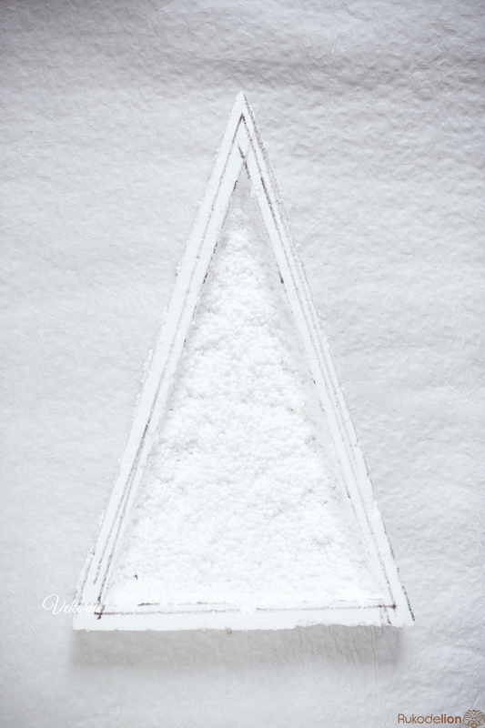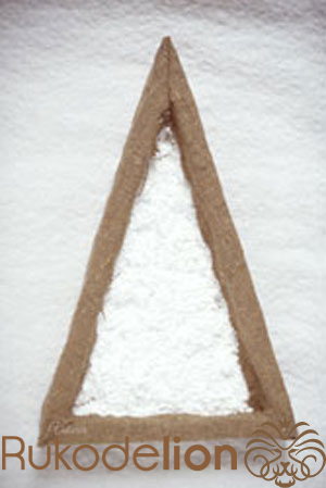 1. Вырежьте из пенопласта треугольник канцелярским ножом. В данном панно нижняя часть составляла 25 см, боковые части 41 см. Ширина бортика 2 см.