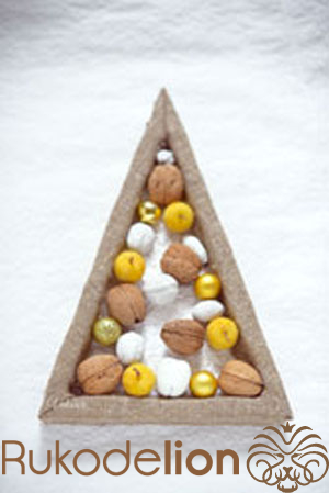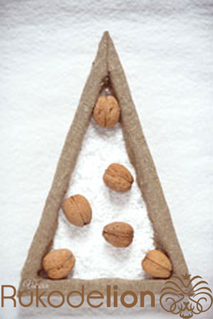 4. Приклейте большие орехи внутри основы: три в углах и три внутри, создавая треугольник.