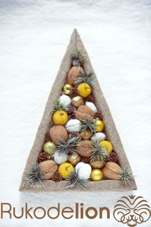Материалы: - пенопласт - мешковина - орехи - яблоки из пластика - елочные шарики - акриловая белая краска - шишки лиственницы - желуди - ветки ели из пластика - золотой волос - ягоды из пластика - шпагат - маркер -канцелярский нож - ножницы - клей горячий пистолет