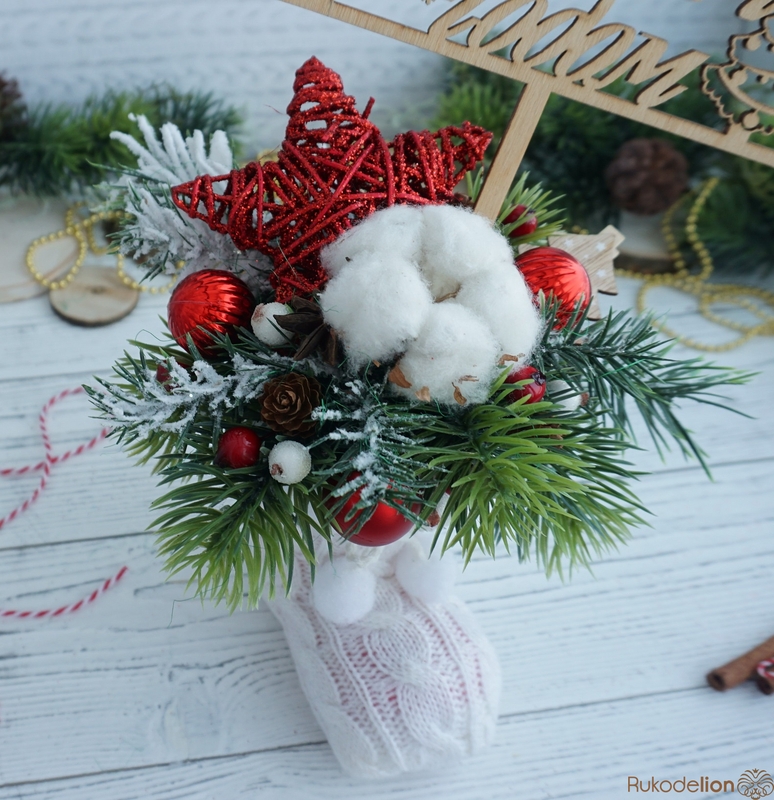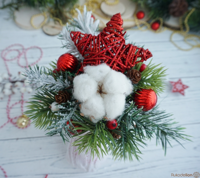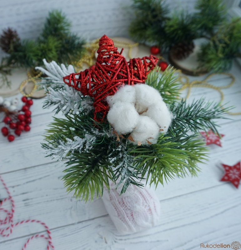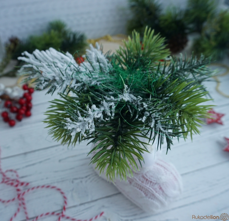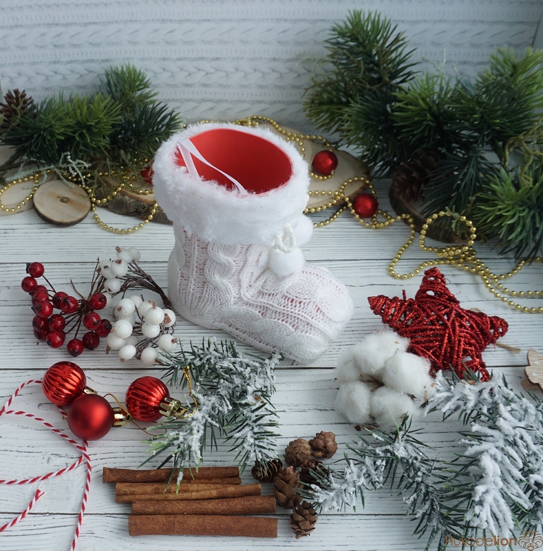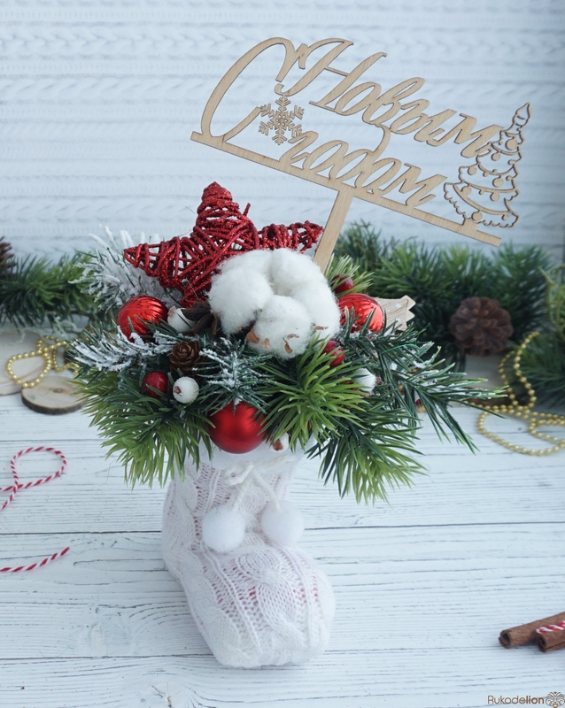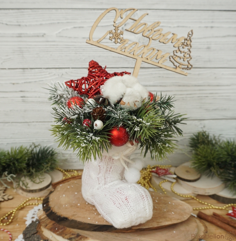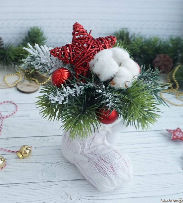 сапожок, хвойные веточки, небольшие по размеру елочные шарики, шишки, ягодки, хлопок и другой декор на ваш вкус.
