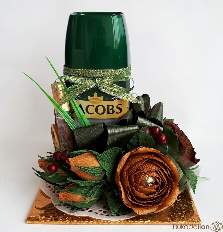 Оформление баночки кофе 95 гр. В цветах и бутонах конфеты Марсианка три шоколада , 2 шт шоколад Merci.