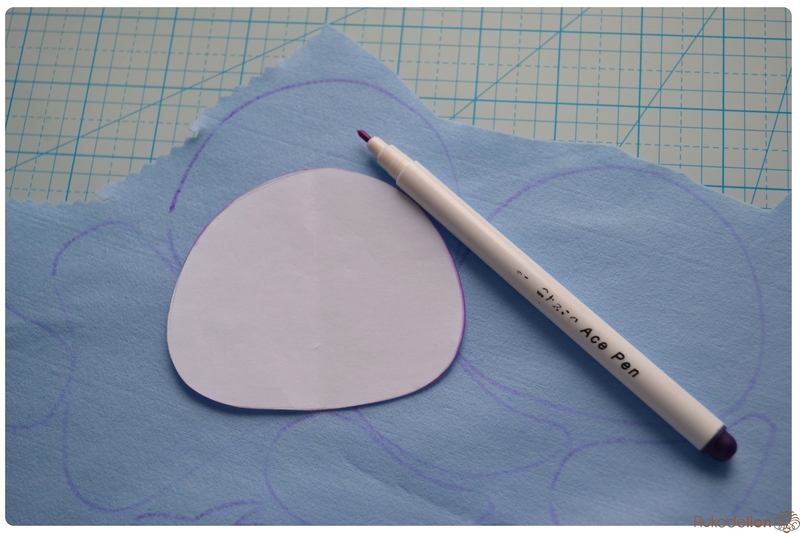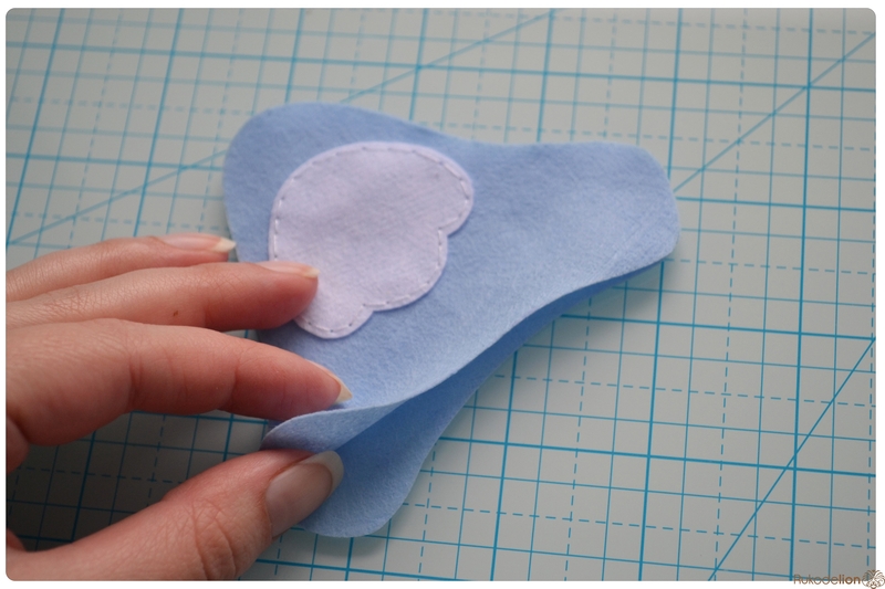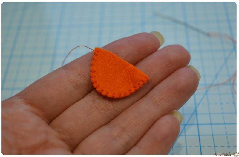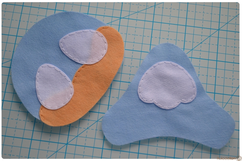 Для того чтобы разместить клюв ровно по середине головы, нарисуйте самоисчезающим маркером линию ровно по середине головы сверху вниз. Прикладывая клюв к голове, ориентируйтесь на эту линию. Начинаем пришивать клюв.