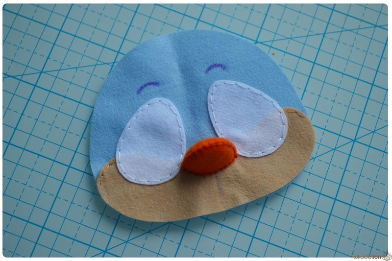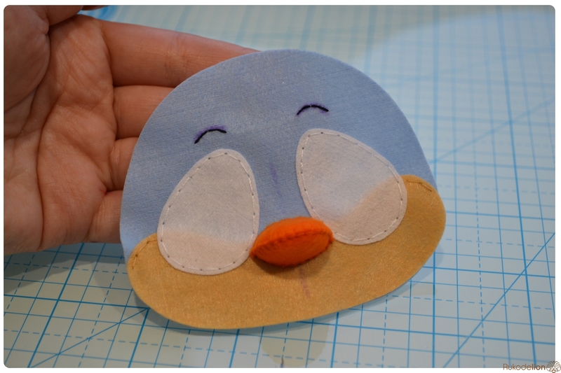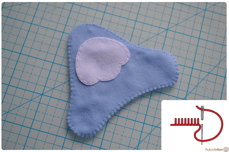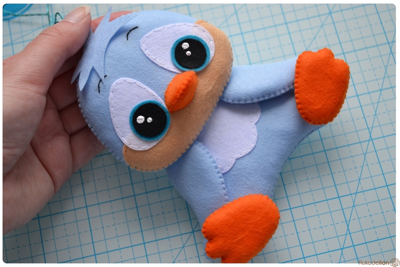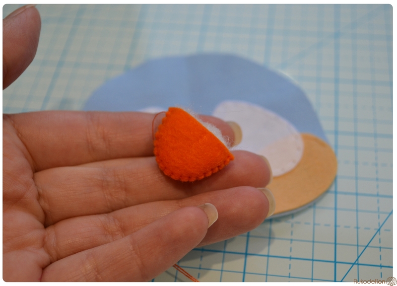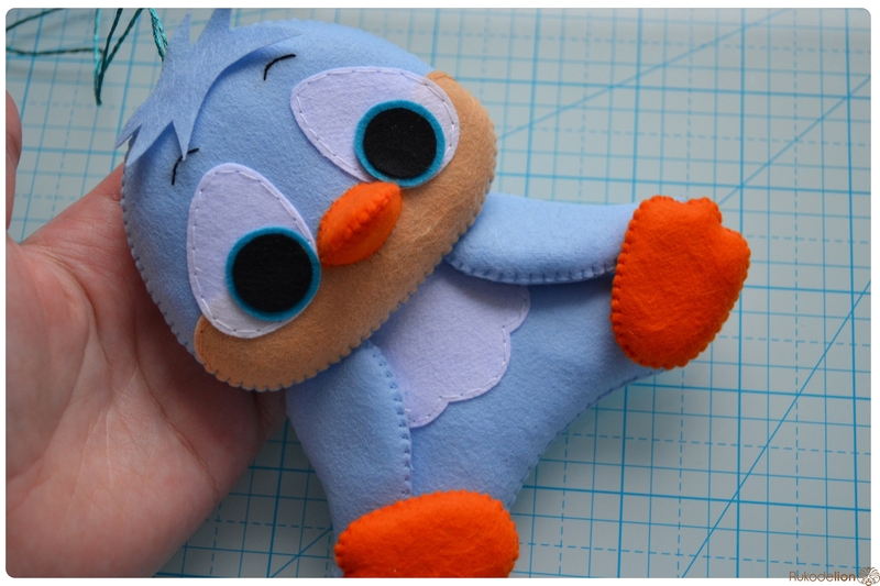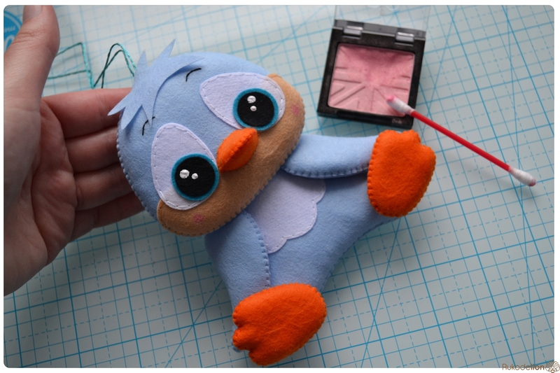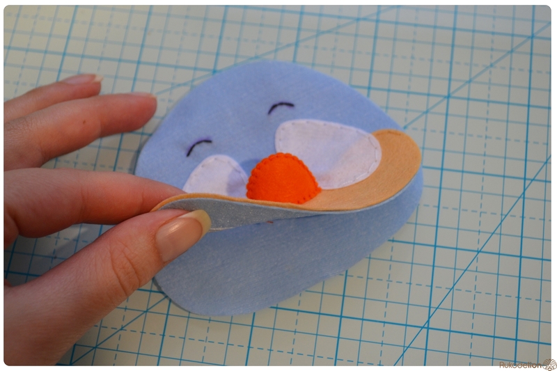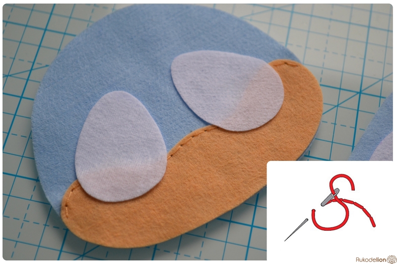 На уголке клюва у нас осталась нитка с иголкой. Вдеваем иголку в мордочку, в том месте, где у нас оказался левый край клюва, и пропускаем нить насквозь голубой детали. Затем возвращаем нить чуть выше клюва. Теперь вдеваем ее в край клюва и проводим через клюв и голубую деталь вниз и так по спирали по часовой стрелке мелким стежками мы пришиваем клюв, сначала сверху, затем снизу