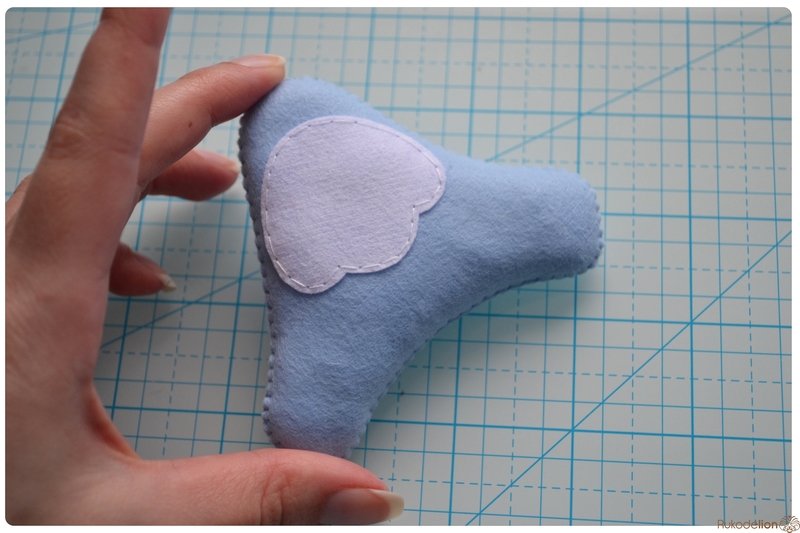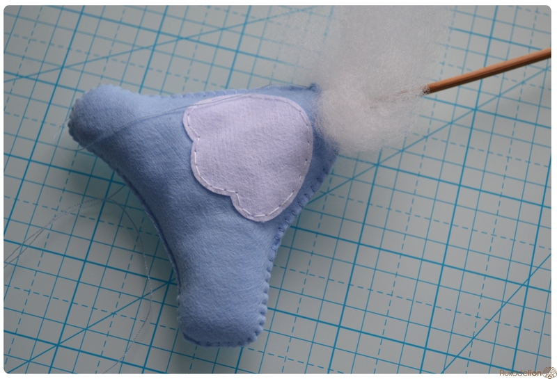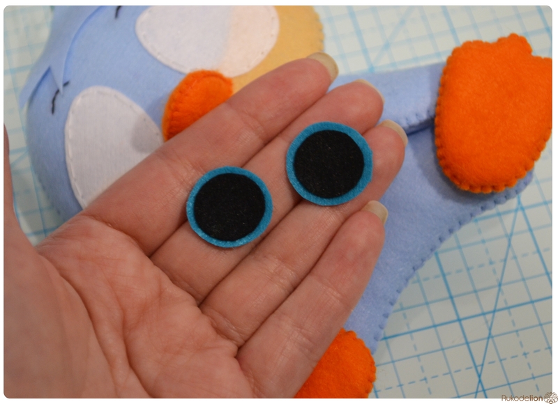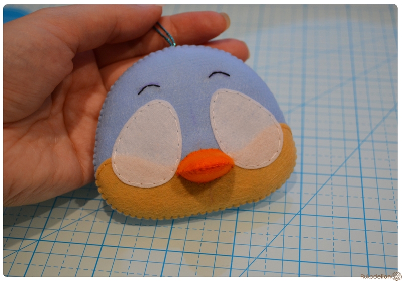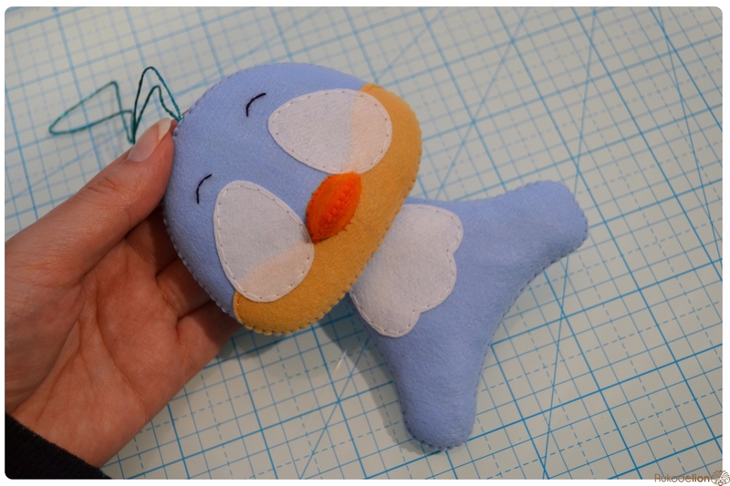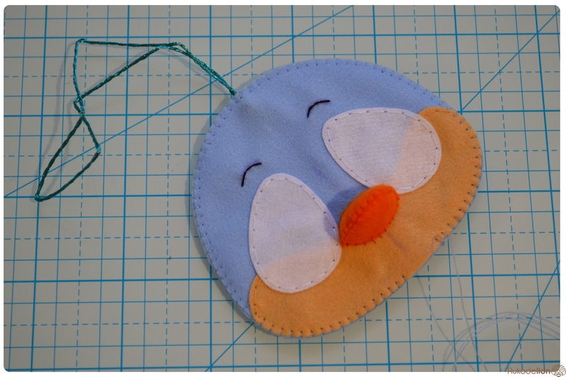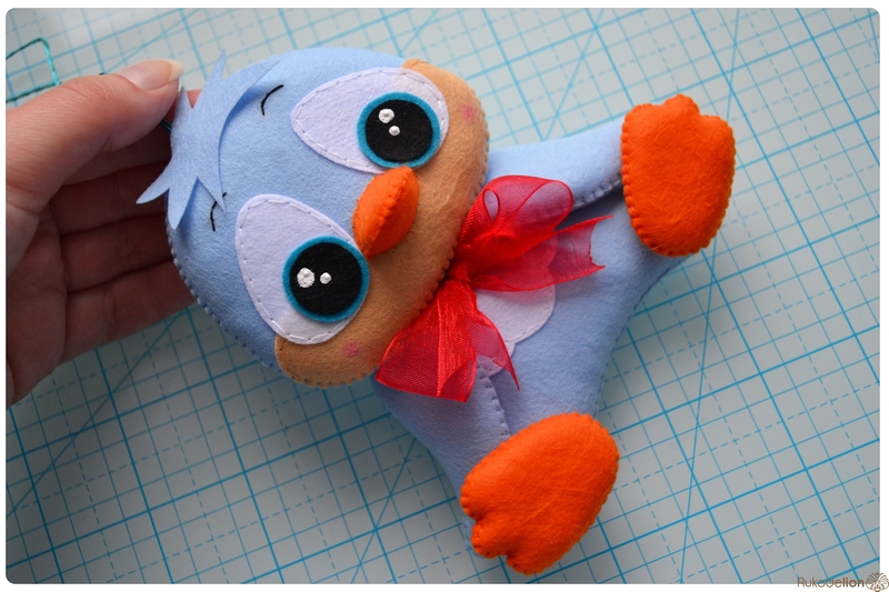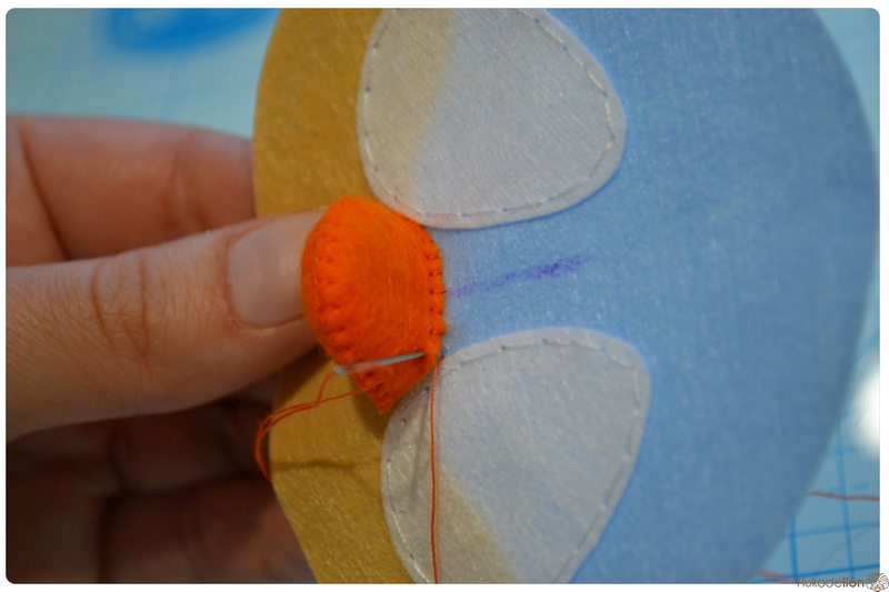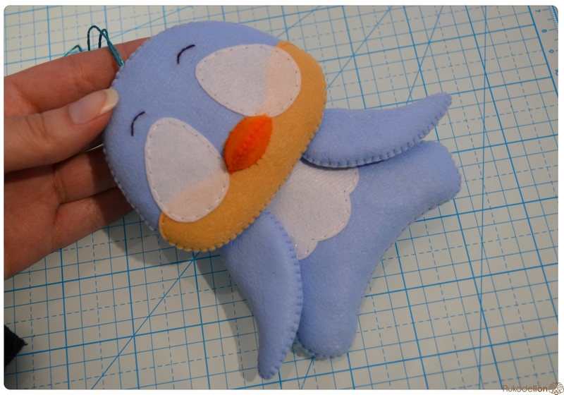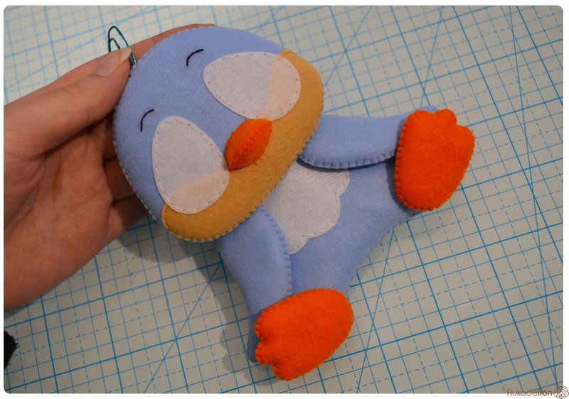 На уголке клюва у нас осталась нитка с иголкой. Вдеваем иголку в мордочку, в том месте, где у нас оказался левый край клюва, и пропускаем нить насквозь голубой детали. Затем возвращаем нить чуть выше клюва. Теперь вдеваем ее в край клюва и проводим через клюв и голубую деталь вниз и так по спирали по часовой стрелке мелким стежками мы пришиваем клюв, сначала сверху, затем снизу