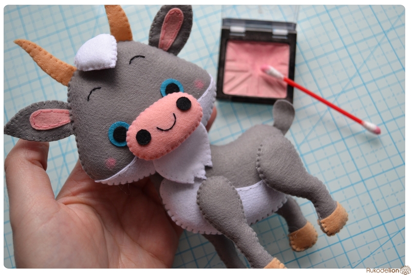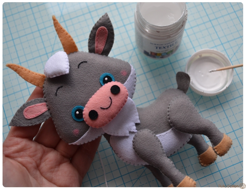 3. Инструменты и прочее: иголка, ножницы, синтепон, белая краска по ткани, румяна, пуговка, самоисчезающий маркер, клеевой пистолет со стержнем, клей "Момент Кристалл" (либо любой другой ваш любимый текстильный клей), пробойник по фетру и декоративный шнурок для подвешивания.
