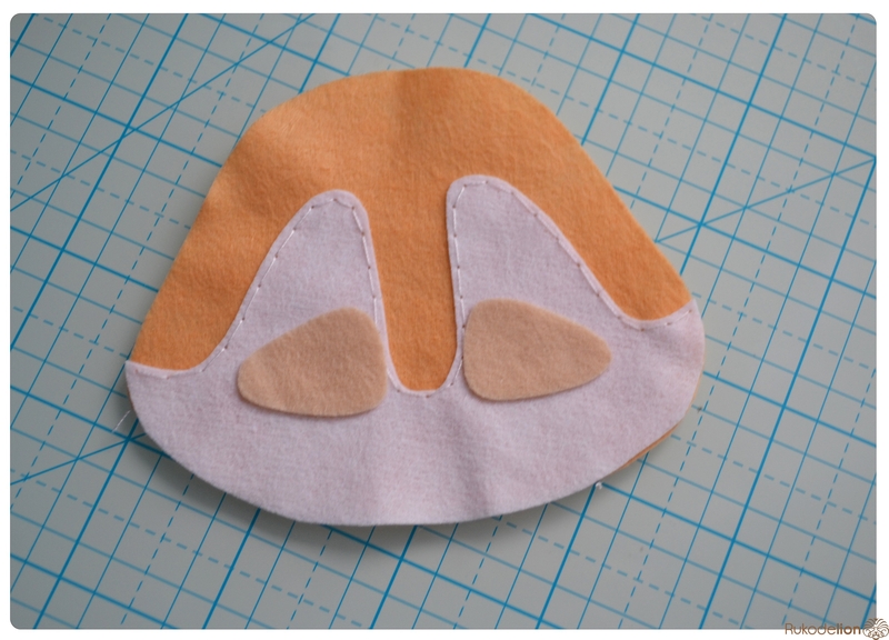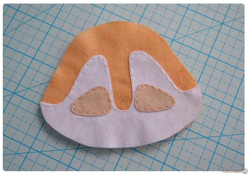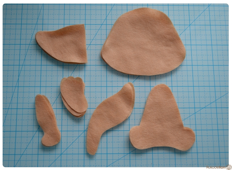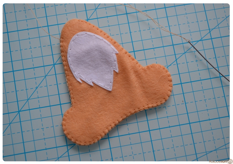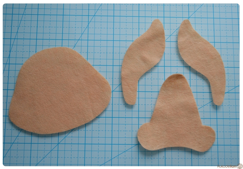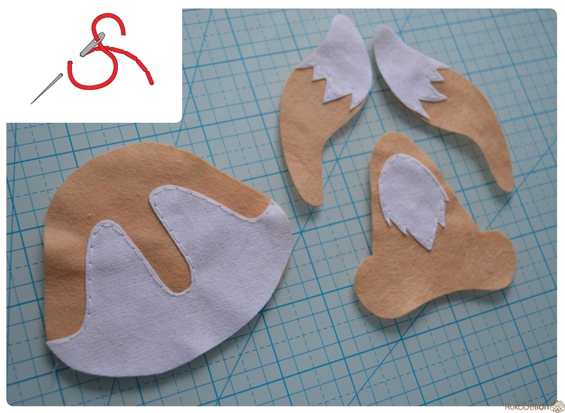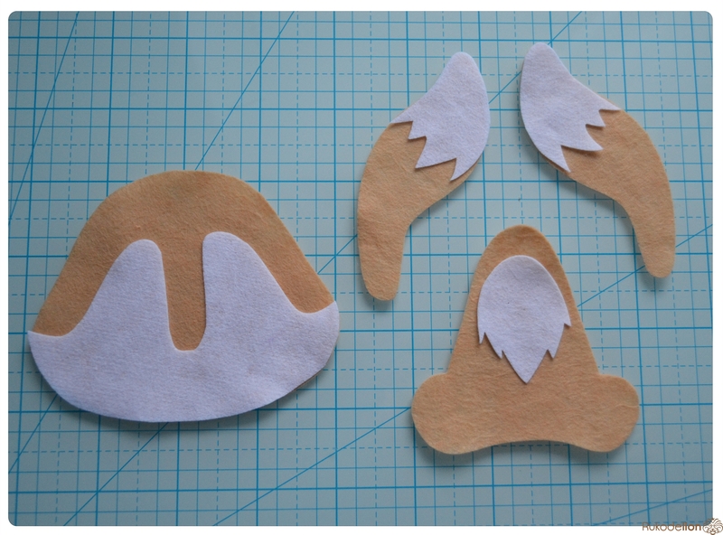 Из белого фетра вырезаем по одной детали обода мордочки и грудки и по две детали мордочки и кончика хвоста