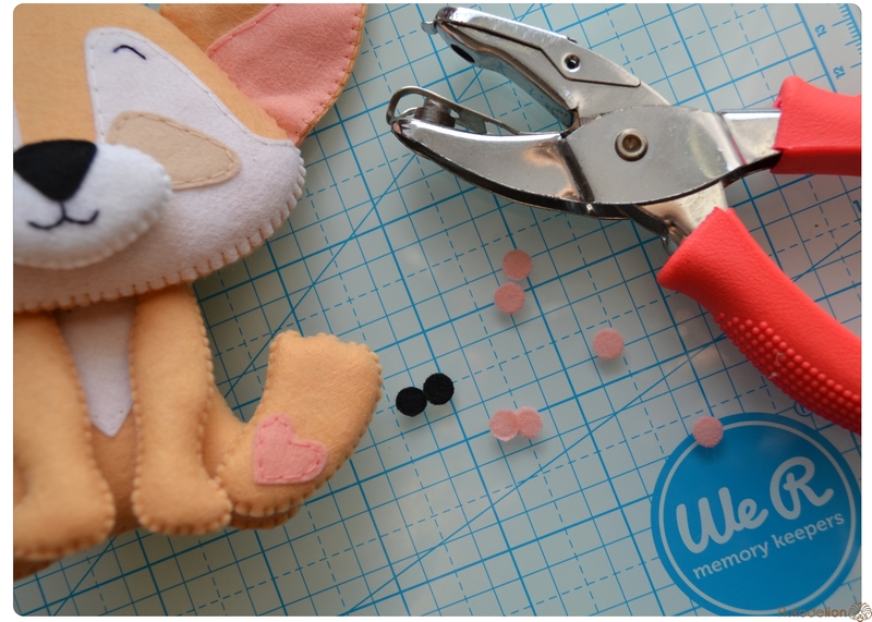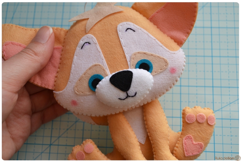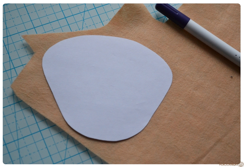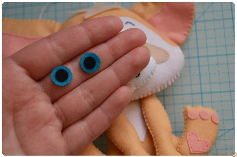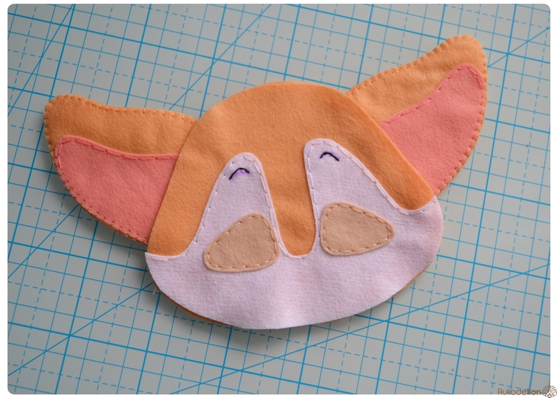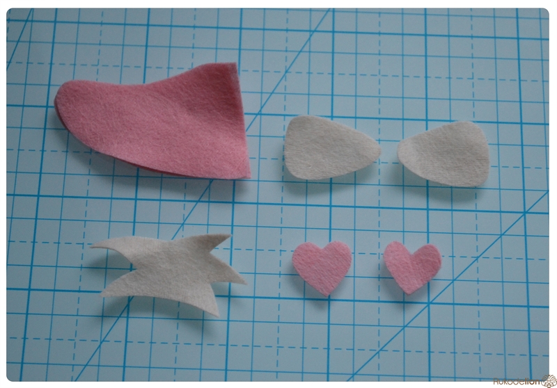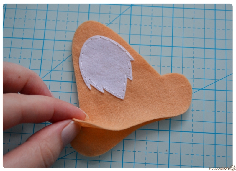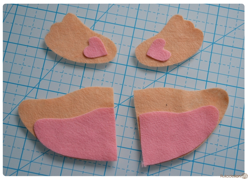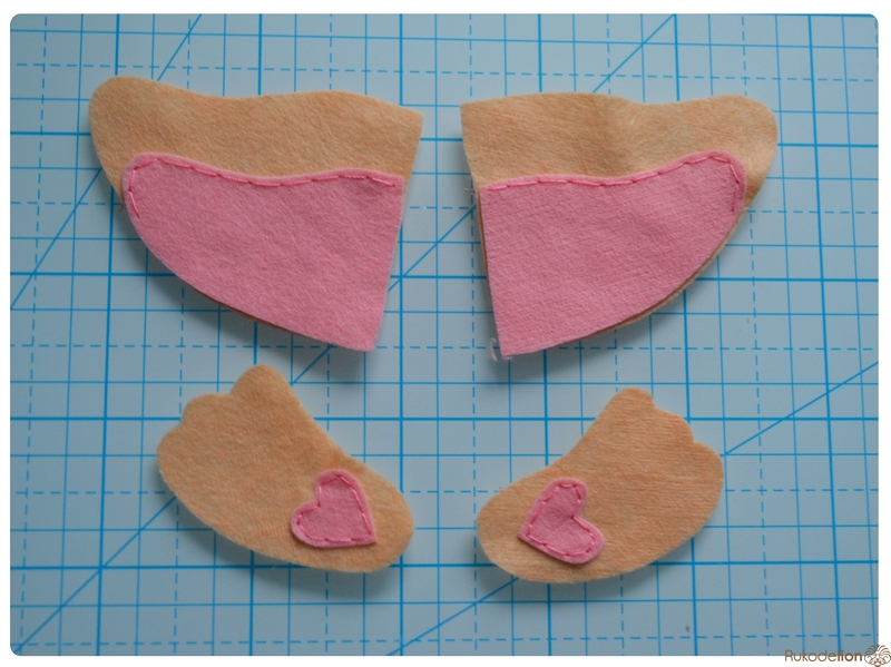 Из молочного фетра вырезаем челочку и два обода глаз, а из розового фетра- две внутренних части ушек. Так же из розового фетра я вырезаю два сердечка - решила сделать такие миленькие пяточки фенеку