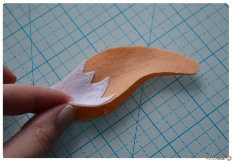Ну и раз мы начали работать белыми нитками, давайте сразу сошьем вместе белый кончик хвоста. Для этого складываем вместе две детали хвоста...