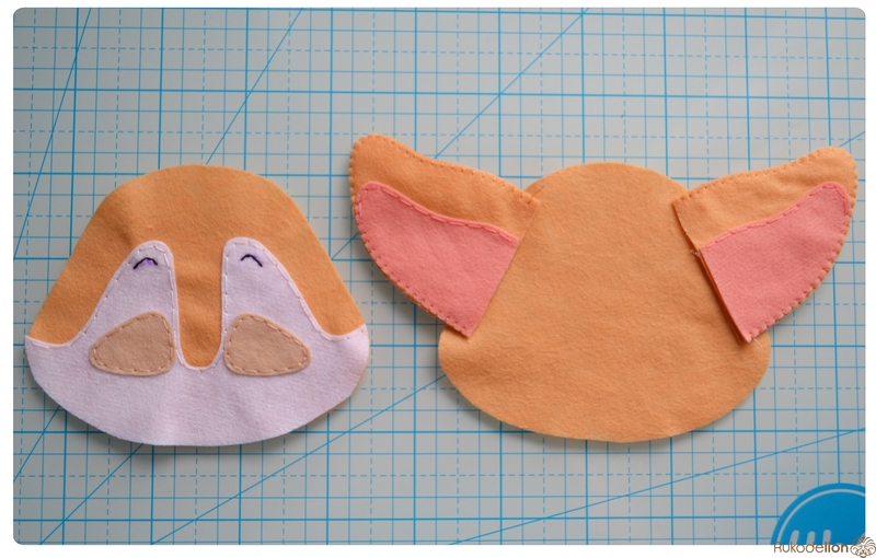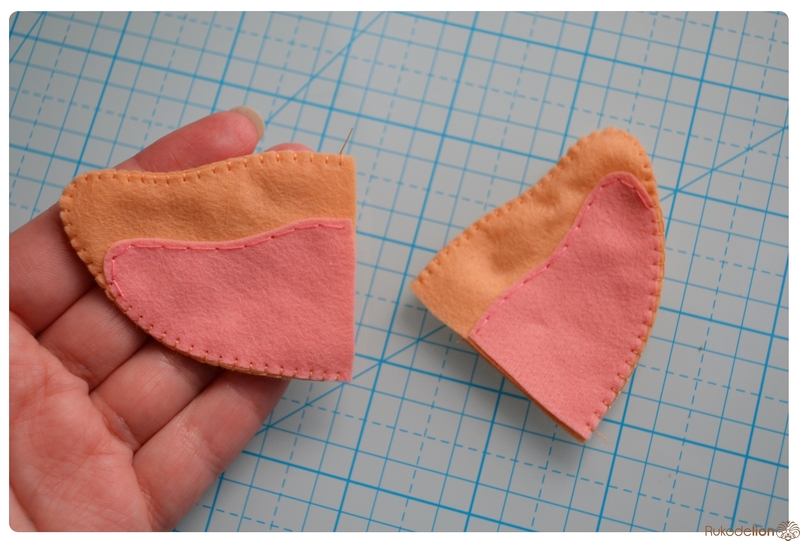 Берем две детали головы. На одной у нас уже пришиты детали, а вот на второй раскладываем ушки. Для удобства пришивания , ушки можно зафиксировать капелькой клея