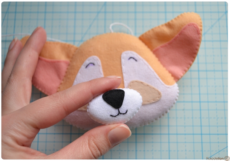 Прикладываем носик к мордочке. Чтобы сделать такой носик нужно вырезать из черного фетра треугольник и скруглить его углы.