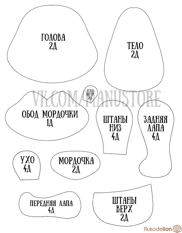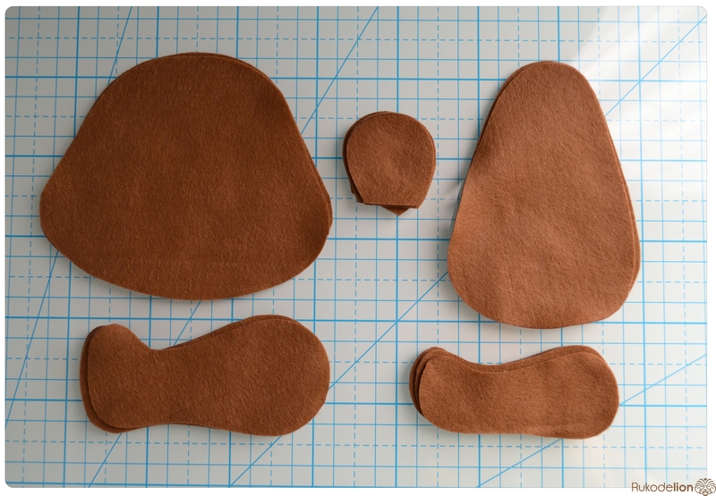 Вырезаем детали по нарисованным линиям. Из коричневого фетра нам нужно вырезать по две детали тела и головы и по четыре детали передних и задних лапок, а также ушек