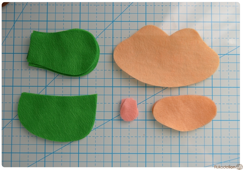 Из зеленого фетра вырезаем четыре детали низа штанишек и две детали верха. Из бежевого фетра - две детали мордочки и одну деталь обода мордочки. Из розового фетра - две внутренних детали уха