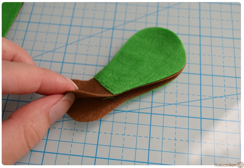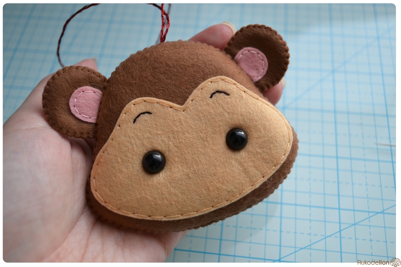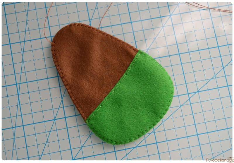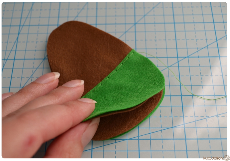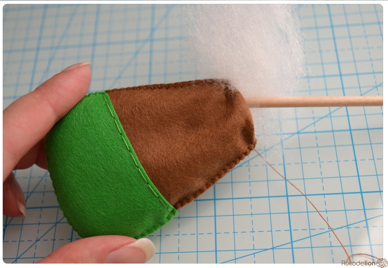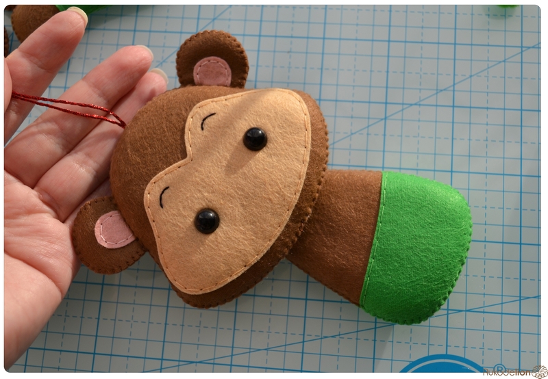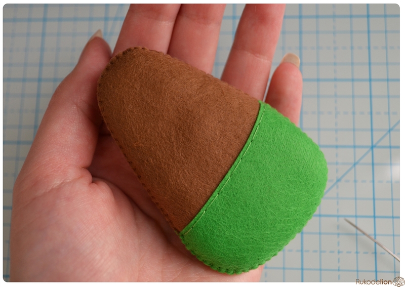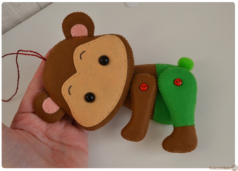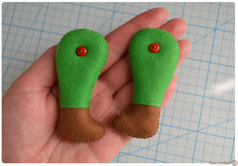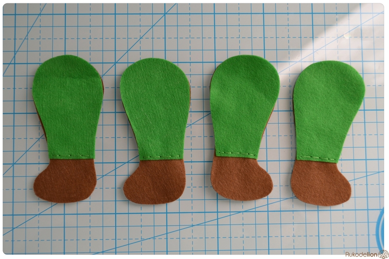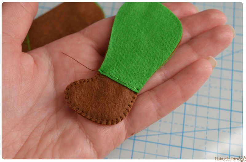 ...затем зеленый. Набиваем лапки синтепоном, заканчиваем петельный шов и пришиваем красные пуговицы у основания лапок