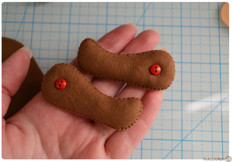 Передние лапки так же сшиваем и набиваем синтепоном. У основания пришиваем красные пуговицы